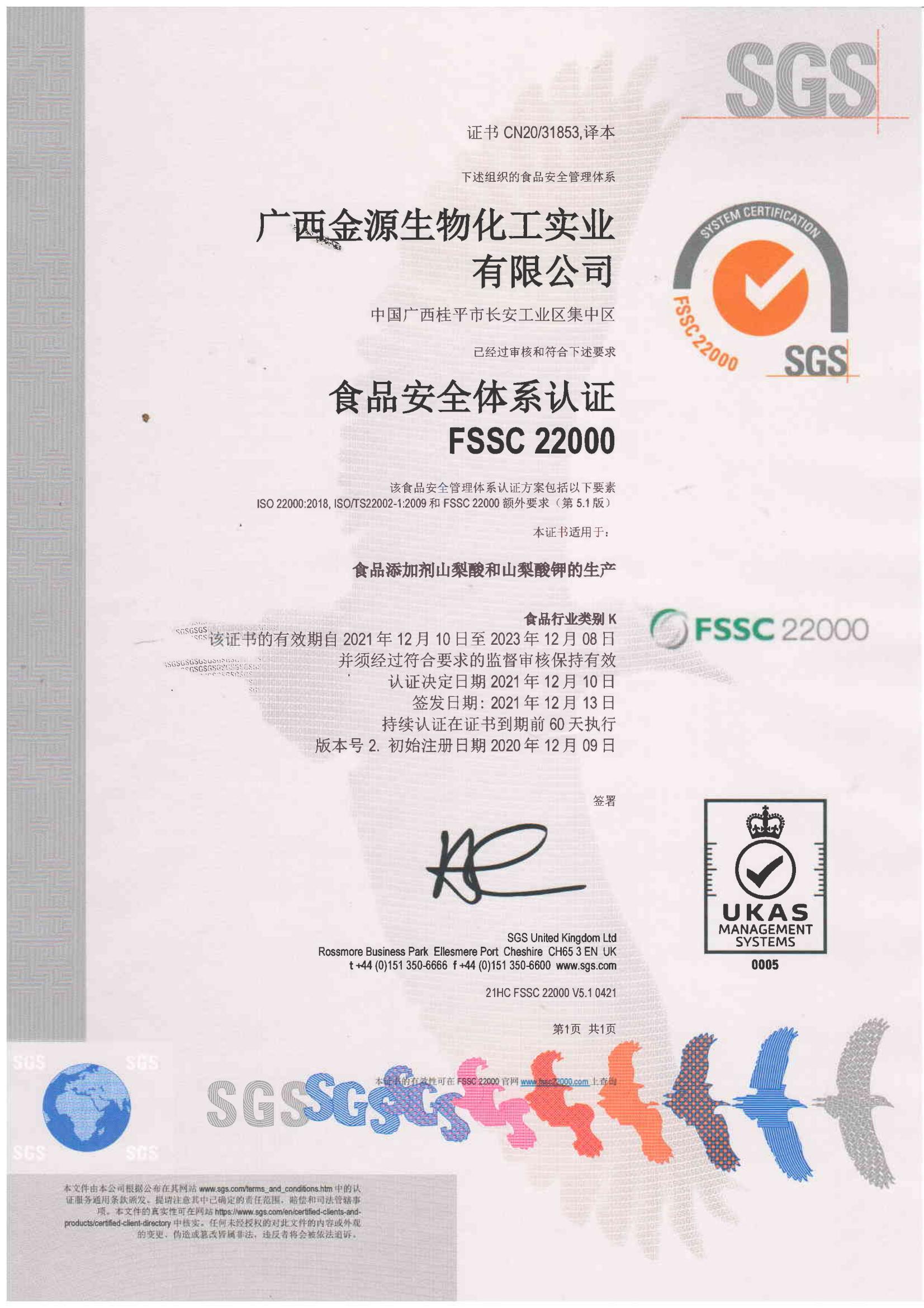 山梨酸、山梨酸鉀(食品安全體系認(rèn)證證書)